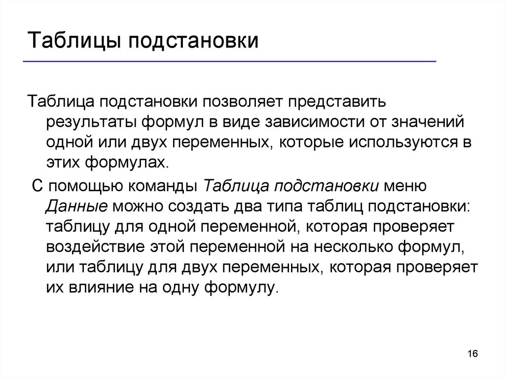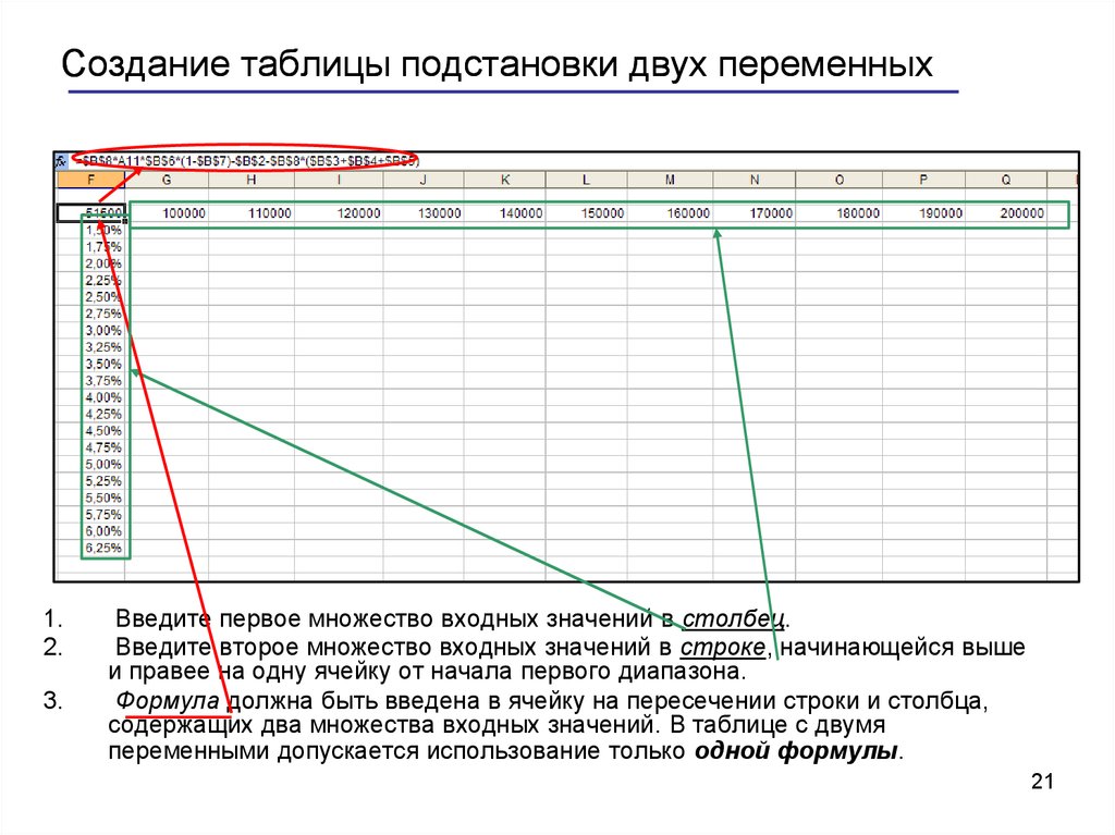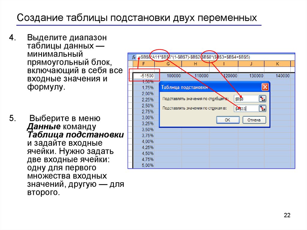 Создание таблицы подстановки одной переменнойПри создании этой таблицы Excel