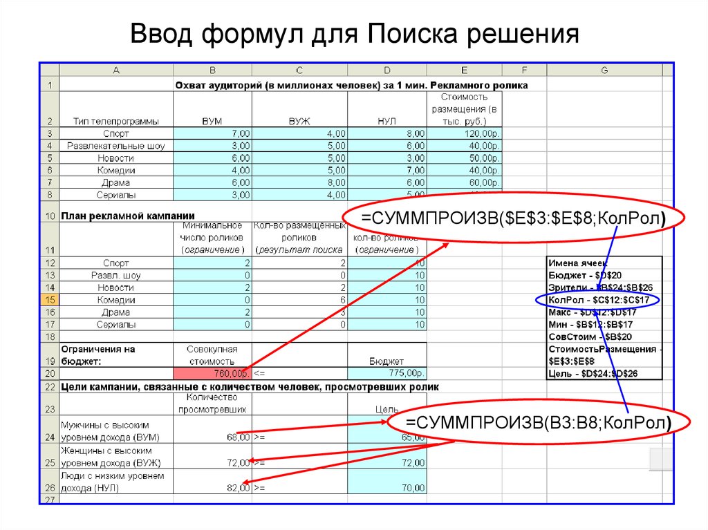 Ввод формул для Поиска решения=СУММПРОИЗВ($E$3:$E$8;КолРол)