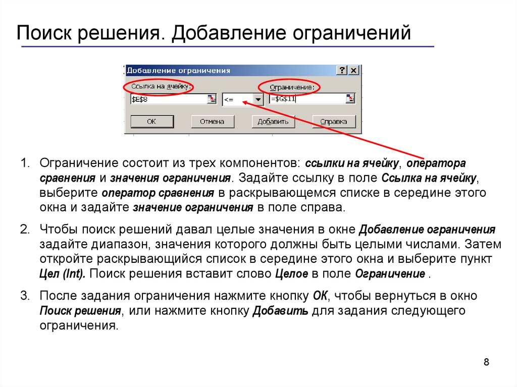 Цел (Int). Поиск решения вставит слово Целое в поле Ограничение .