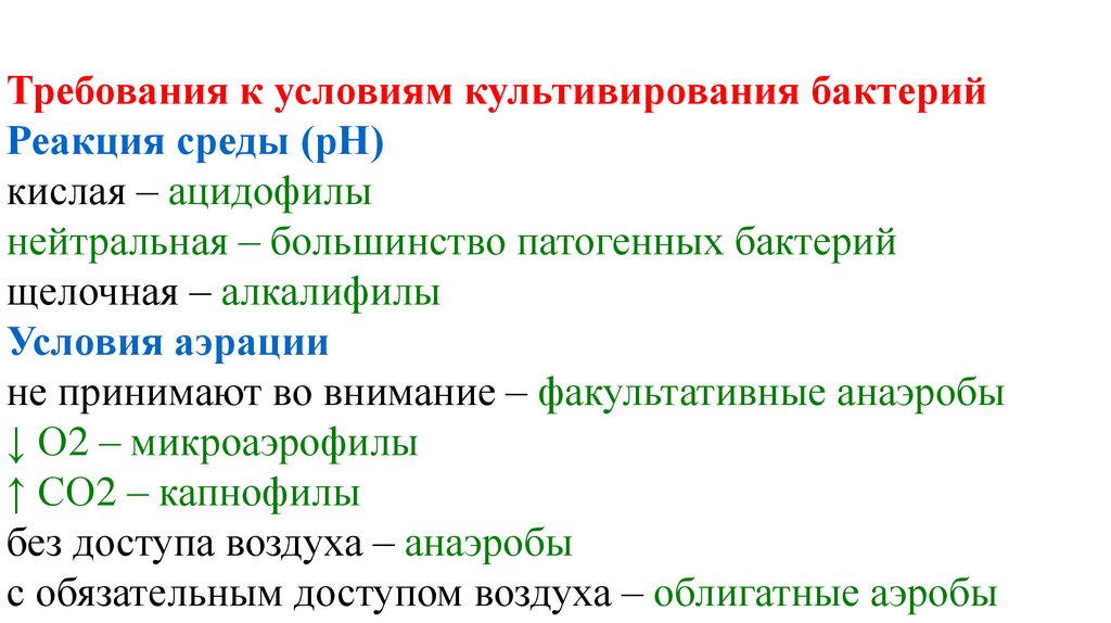 Требования к условиям культивирования бактерийРеакция среды (рН)