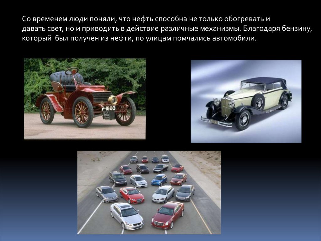 Со временем люди поняли, что нефть способна не только обогревать идавать свет, но и приводить в действие различные механизмы. Благодаря бензину,