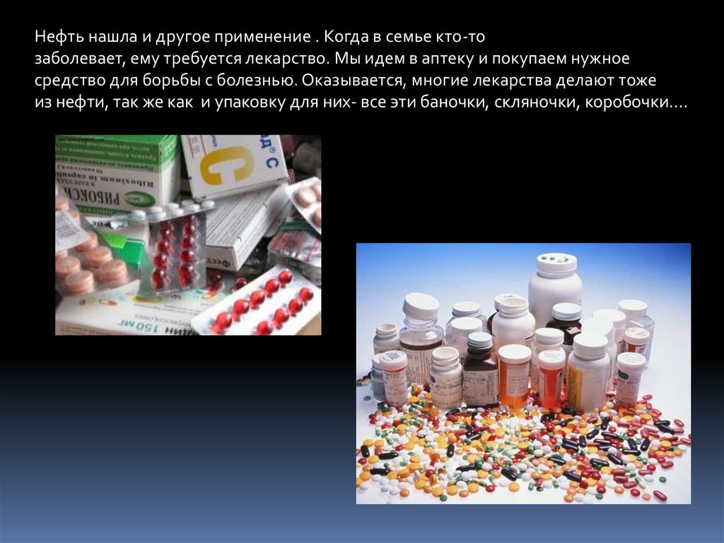 Нефть нашла и другое применение . Когда в семье кто-тозаболевает, ему требуется лекарство. Мы идем в аптеку и покупаем нужное
