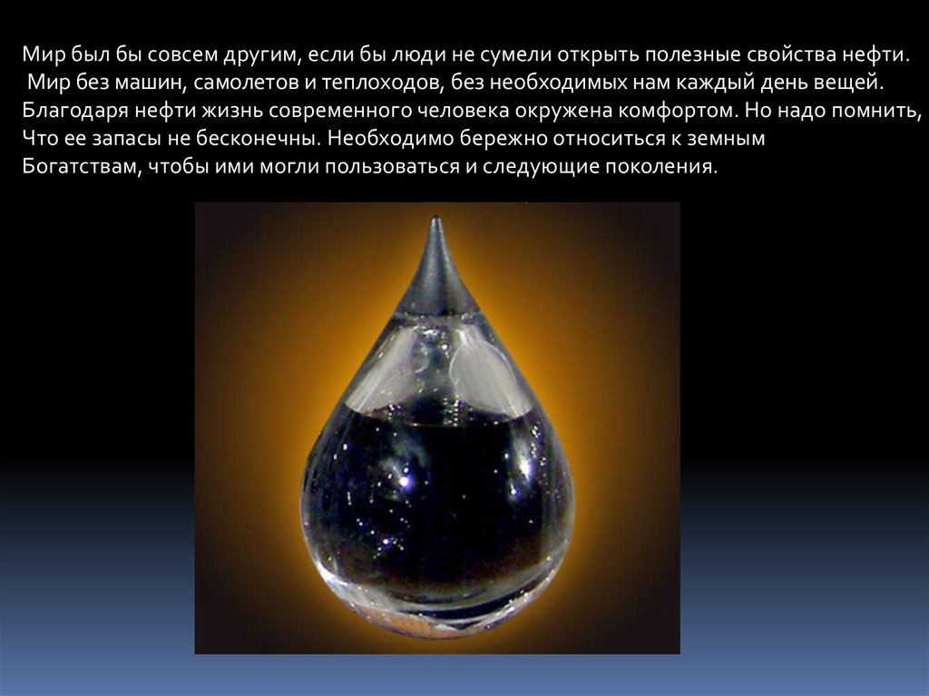 Мир был бы совсем другим, если бы люди не сумели открыть полезные свойства нефти.Мир без машин, самолетов и теплоходов, без необходимых нам каждый день вещей.