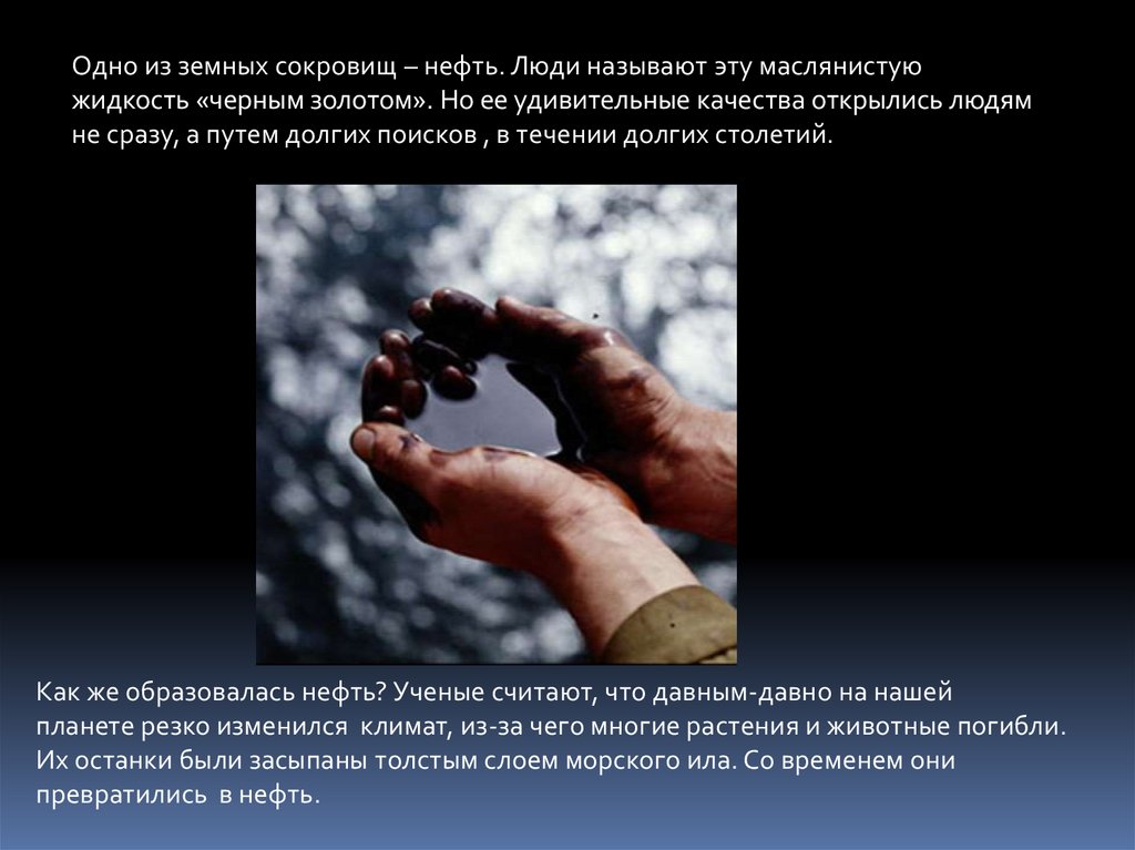 Одно из земных сокровищ – нефть. Люди называют эту маслянистуюжидкость «черным золотом». Но ее удивительные качества открылись людям