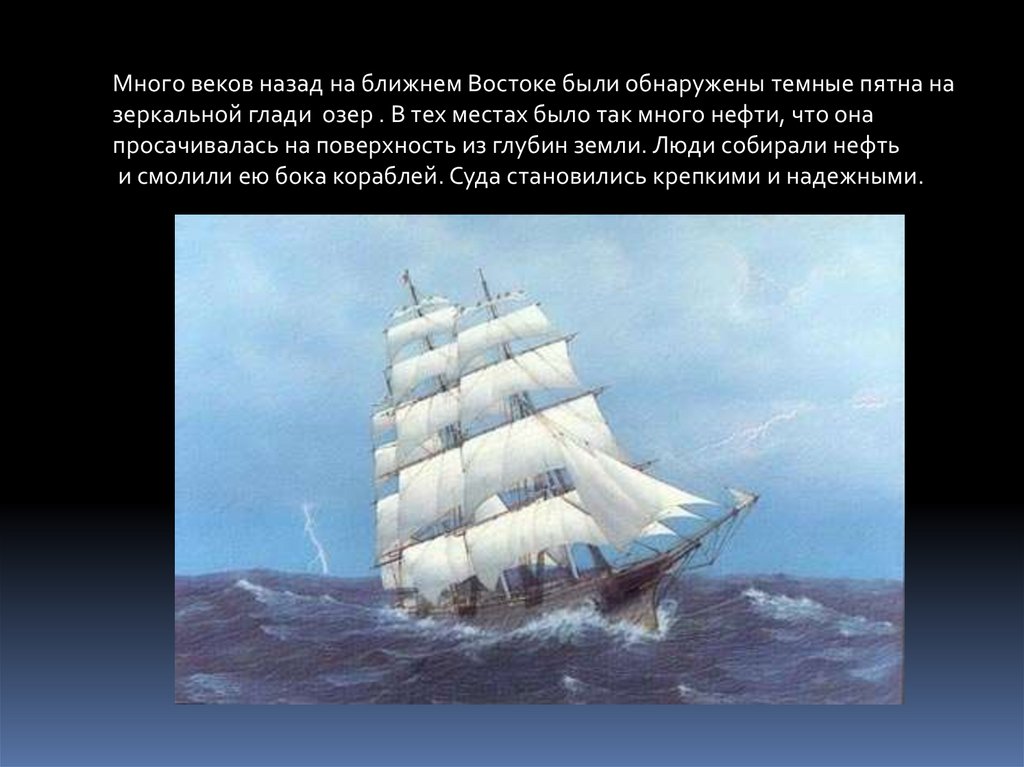 Много веков назад на ближнем Востоке были обнаружены темные пятна назеркальной глади озер . В тех местах было так много нефти, что она