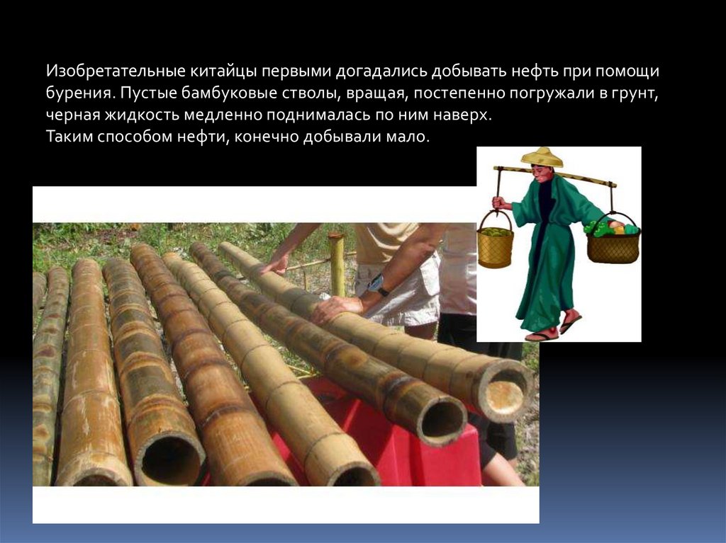 Изобретательные китайцы первыми догадались добывать нефть при помощибурения. Пустые бамбуковые стволы, вращая, постепенно погружали в грунт,
