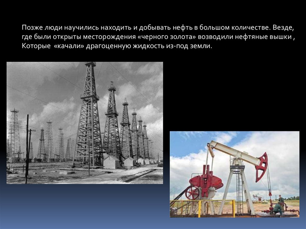 Позже люди научились находить и добывать нефть в большом количестве. Везде,где были открыты месторождения «черного золота» возводили нефтяные вышки ,