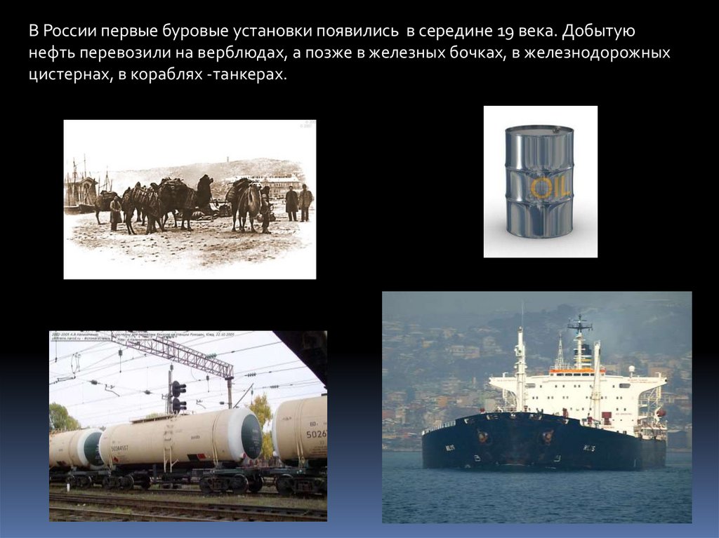 В России первые буровые установки появились в середине 19 века. Добытуюнефть перевозили на верблюдах, а позже в железных бочках, в железнодорожных