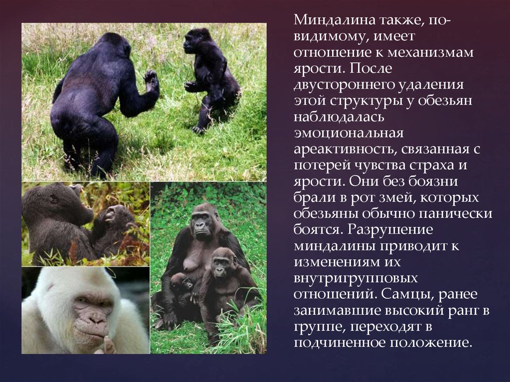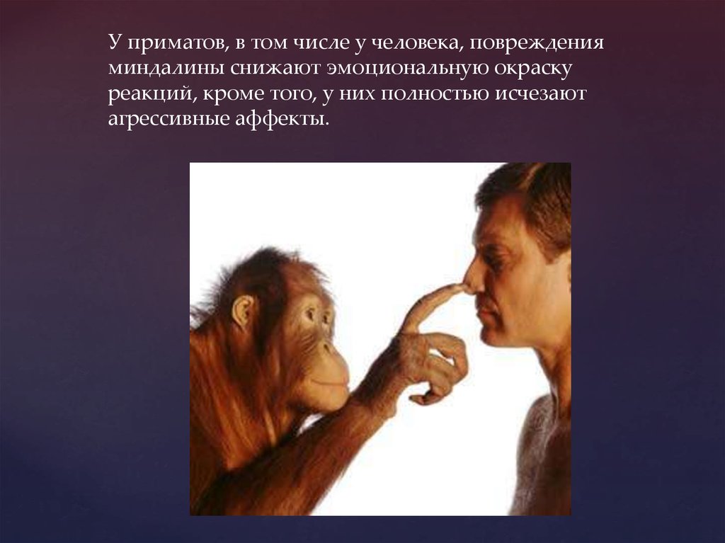 У приматов, в том числе у человека, поврежденияминдалины снижают эмоциональную окраску
