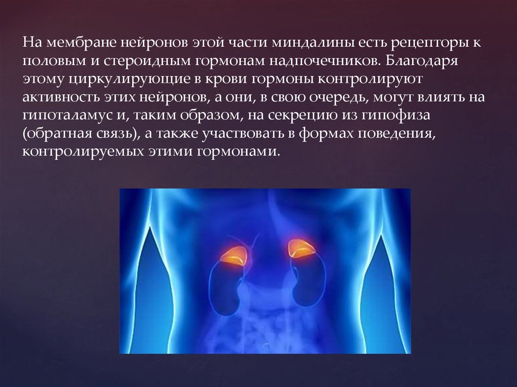 На мембране нейронов этой части миндалины есть рецепторы кполовым и стероидным гормонам надпочечников. Благодаря