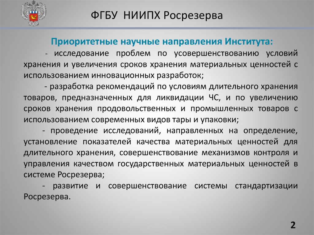 ФГБУ НИИПХ РосрезерваПриоритетные научные направления Института: