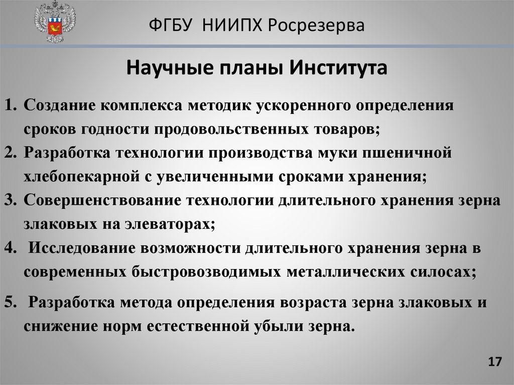 ФГБУ НИИПХ РосрезерваНаучные планы Института