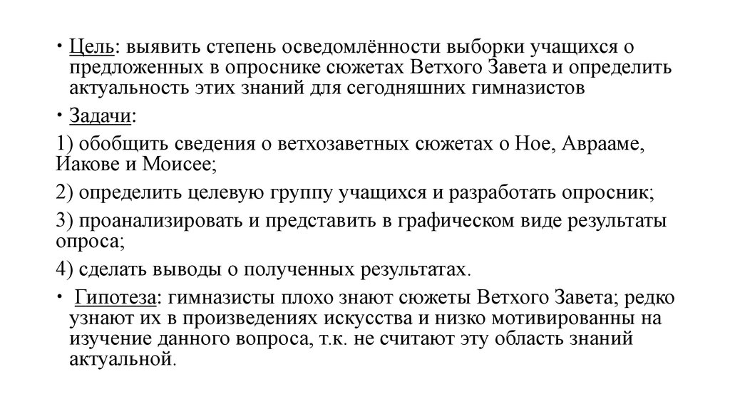 Цель: выявить степень осведомлённости выборки учащихся опредложенных в опроснике сюжетах Ветхого Завета и определить