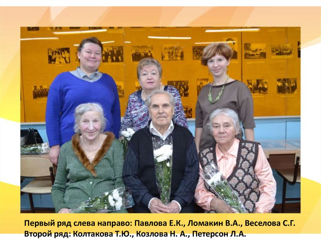 Первый ряд слева направо: Павлова Е.К., Ломакин В.А., Веселова С.Г.Второй ряд: Колтакова Т.Ю., Козлова Н. А., Петерсон Л.А.