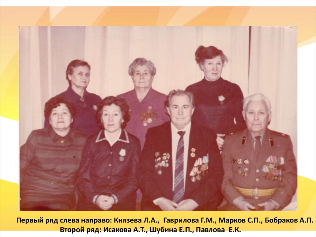 Первый ряд слева направо: Князева Л.А., Гаврилова Г.М., Марков С.П., Бобраков А.П.Второй ряд: Исакова А.Т., Шубина Е.П., Павлова Е.К.