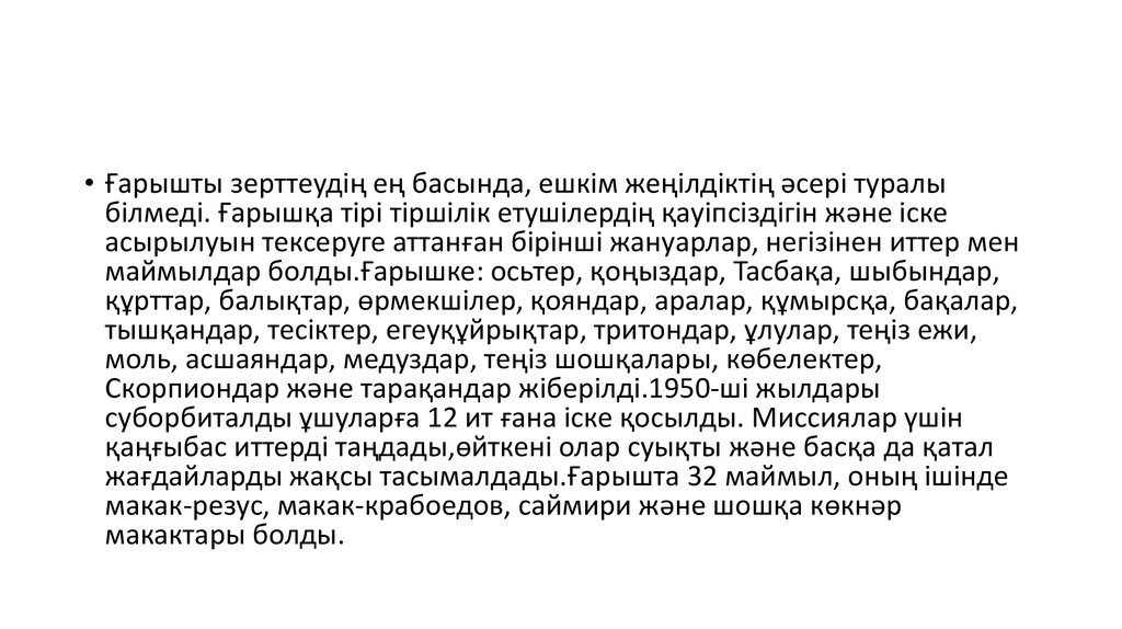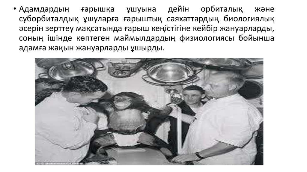 • Адамдардың ғарышқа ұшуына дейін орбиталық жәнесуборбиталдық ұшуларға ғарыштық саяхаттардың биологиялық