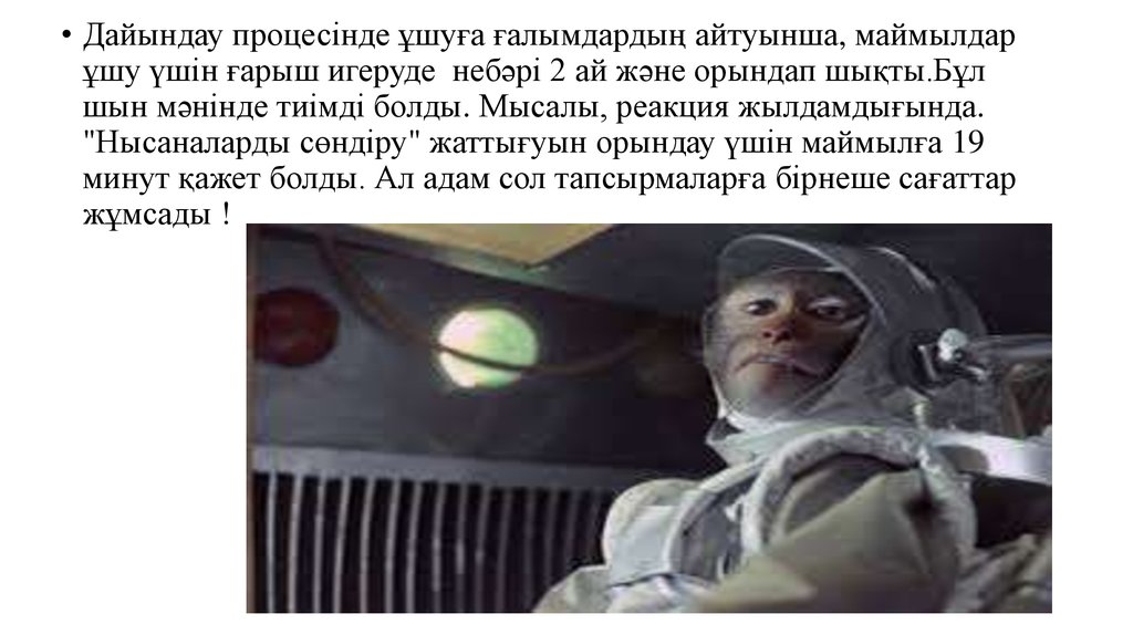 • Дайындау процесінде ұшуға ғалымдардың айтуынша, маймылдарұшу үшін ғарыш игеруде небәрі 2 ай және орындап шықты.Бұл