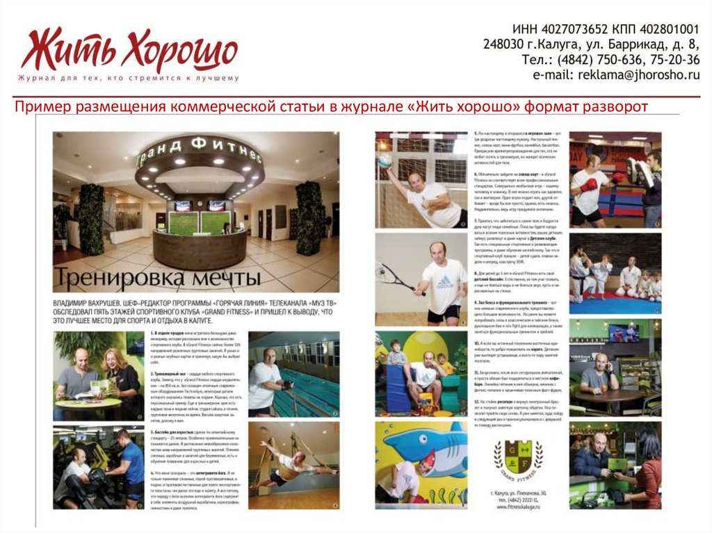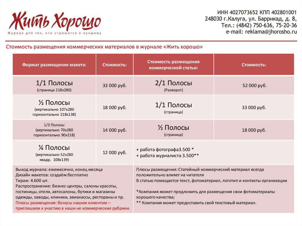 Стоимость размещения коммерческих материалов в журнале «Жить хорошо»Формат размещения макета: