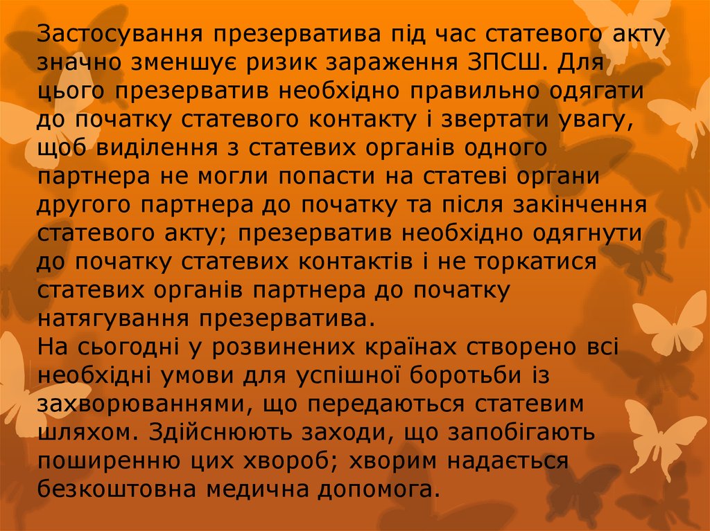 Застосування презерватива під час статевого актузначно зменшує ризик зараження ЗПСШ. Для