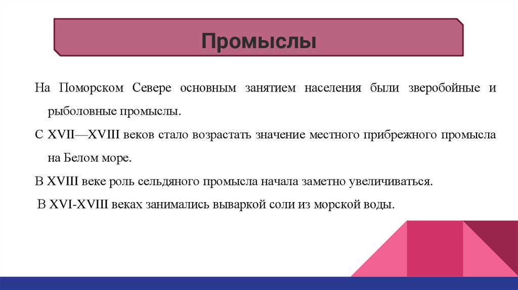 На Поморском Севере основным занятием населения были зверобойные ирыболовные промыслы.