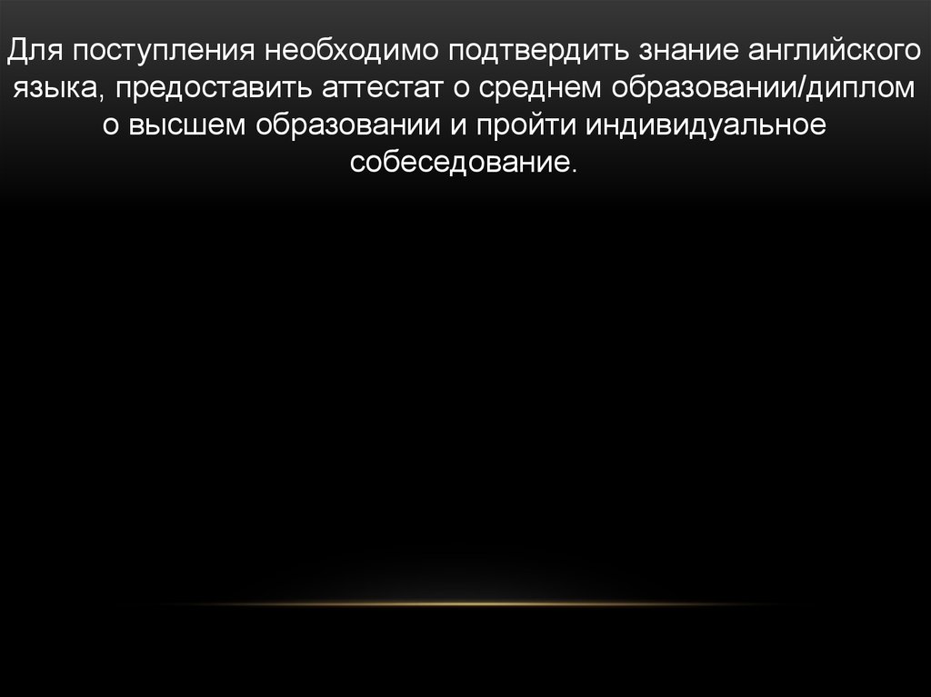 Для поступления необходимо подтвердить знание английскогоязыка, предоставить аттестат о среднем образовании/диплом