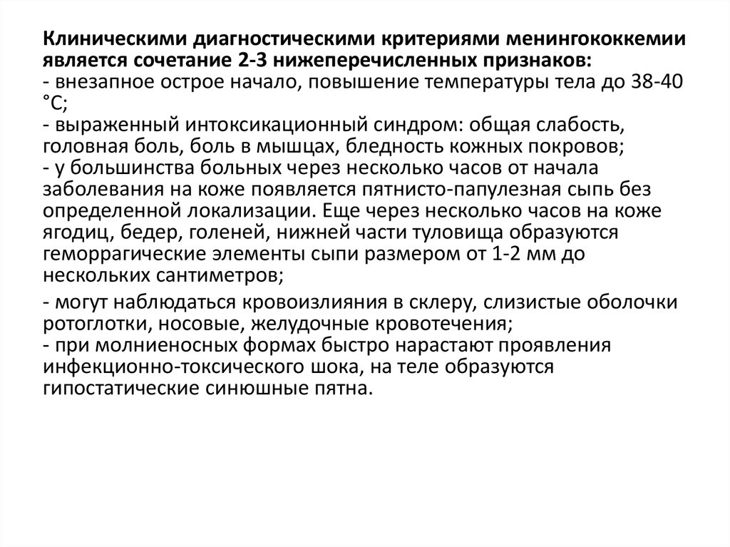 Клиническими диагностическими критериями менингококкемииявляется сочетание 2-3 нижеперечисленных признаков:
