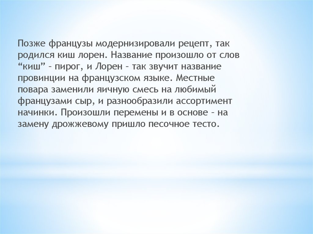 Позже французы модернизировали рецепт, такродился киш лорен. Название произошло от слов