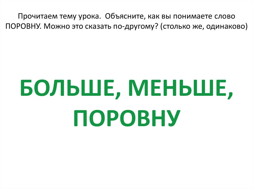 Прочитаем тему урока. Объясните, как вы понимаете словоПОРОВНУ. Можно это сказать по-другому? (столько же, одинаково)