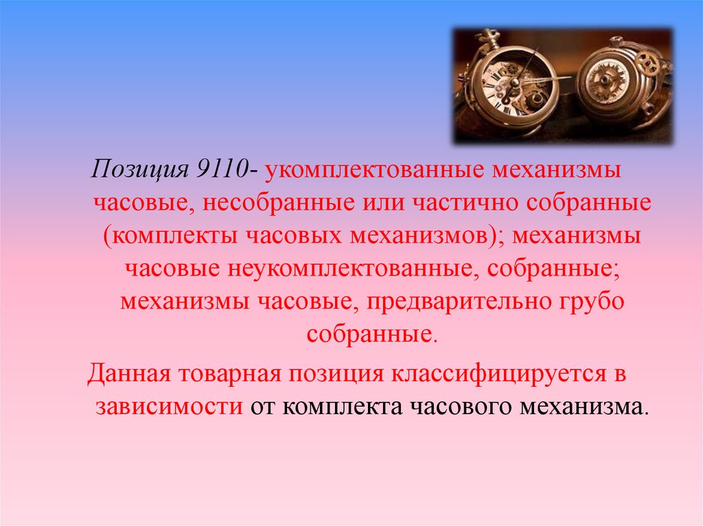 Позиция 9110- укомплектованные механизмычасовые, несобранные или частично собранные