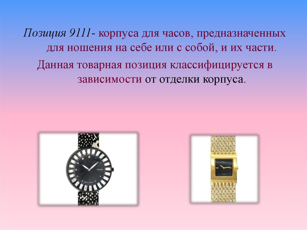 Позиция 9111- корпуса для часов, предназначенныхдля ношения на себе или с собой, и их части.