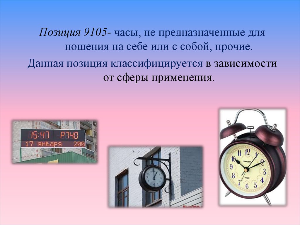 Позиция 9105- часы, не предназначенные дляношения на себе или с собой, прочие.