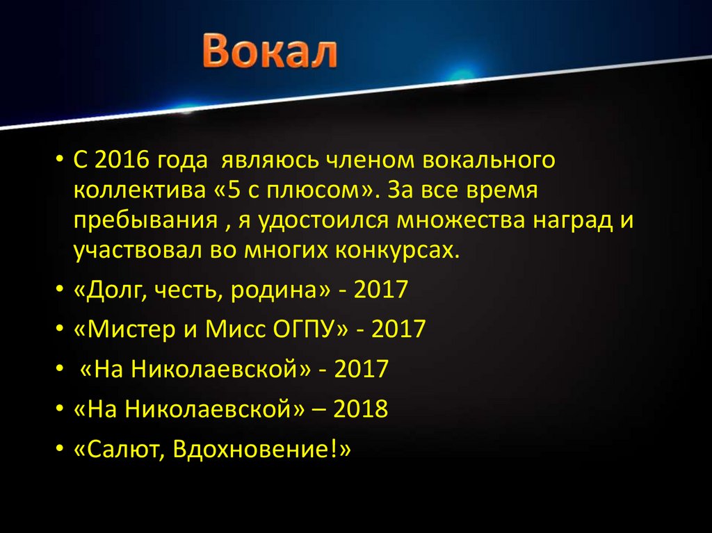 • С 2016 года являюсь членом вокальногоколлектива «5 с плюсом». За все время