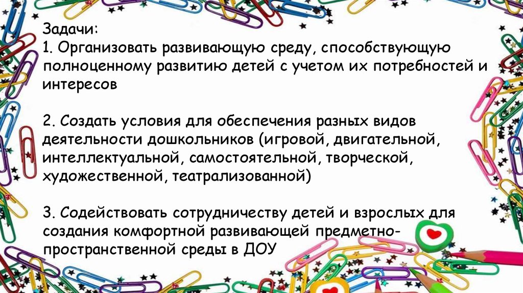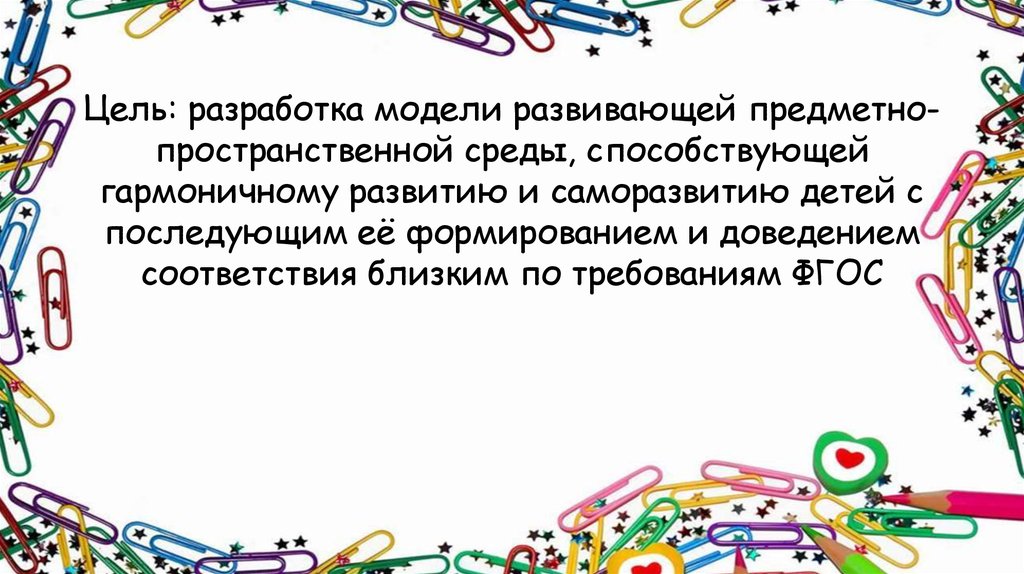 Цель: разработка модели развивающей предметнопространственной среды, способствующейгармоничному развитию и саморазвитию детей с