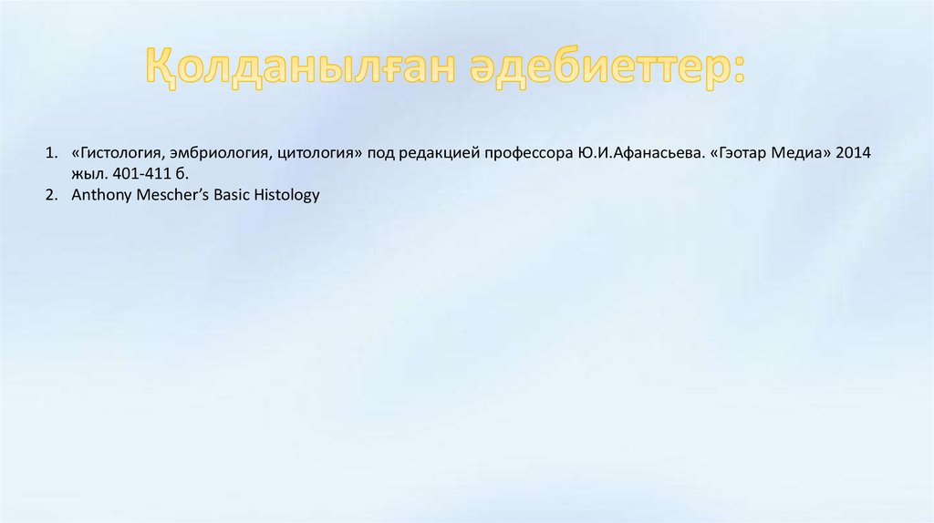 1. «Гистология, эмбриология, цитология» под редакцией профессора Ю.И.Афанасьева. «Гэотар Медиа» 2014жыл. 401-411 б.