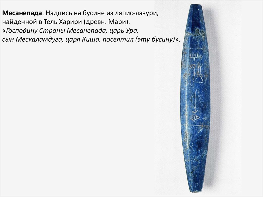 Месанепада. Надпись на бусине из ляпис-лазури,найденной в Тель Харири (древн. Мари).