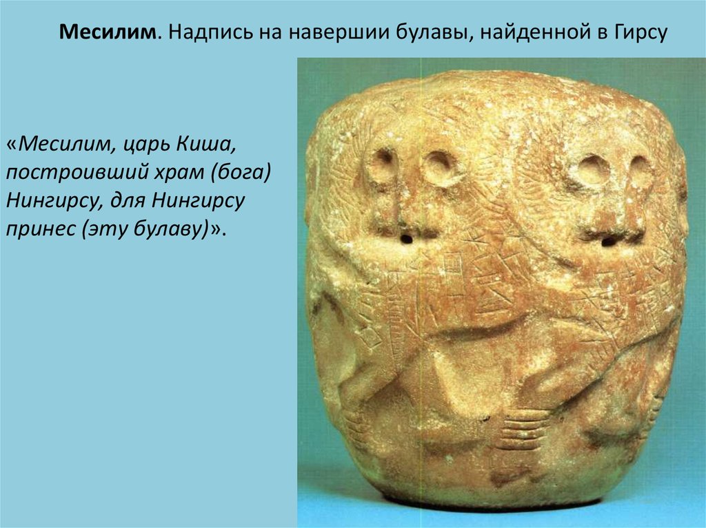 Месилим. Надпись на навершии булавы, найденной в Гирсу«Месилим, царь Киша,