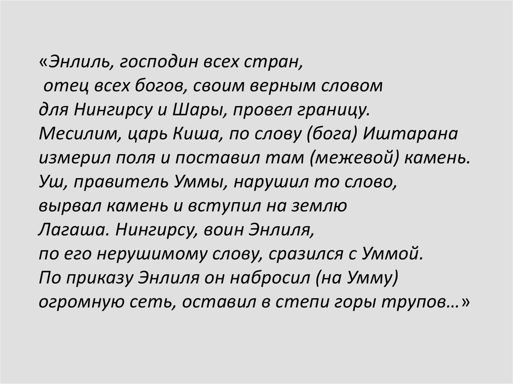 «Энлиль, господин всех стран,отец всех богов, своим верным словом