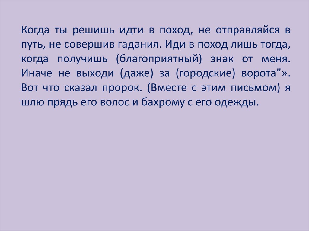 Когда ты решишь идти в поход, не отправляйся впуть, не совершив гадания. Иди в поход лишь тогда,