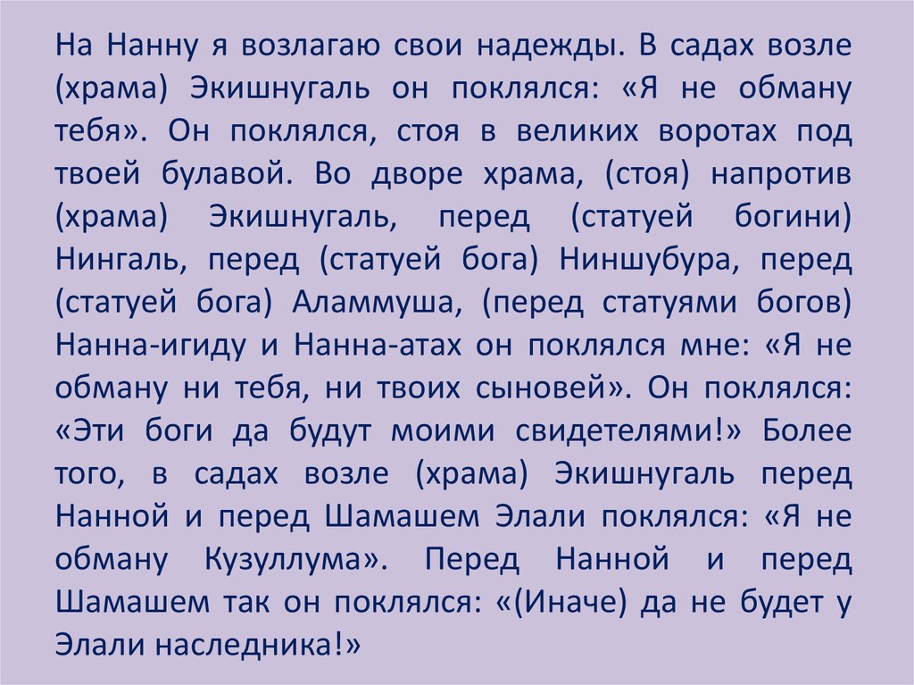 На Нанну я возлагаю свои надежды. В садах возле(храма) Экишнугаль он поклялся: «Я не обману