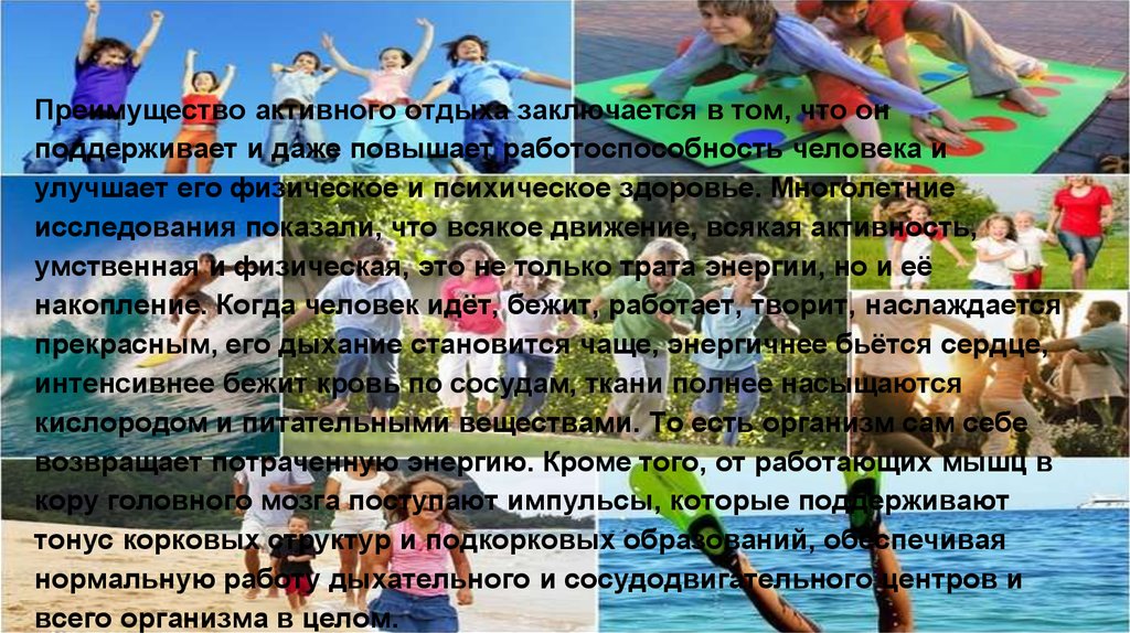 Преимущество активного отдыха заключается в том, что онподдерживает и даже повышает работоспособность человека и