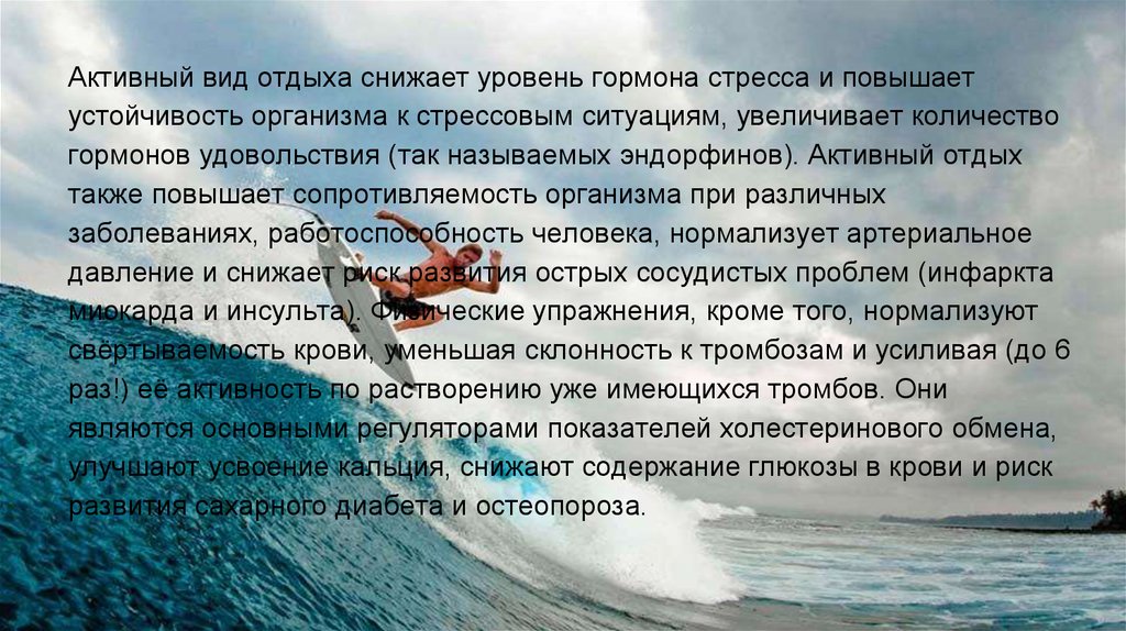 Активный вид отдыха снижает уровень гормона стресса и повышаетустойчивость организма к стрессовым ситуациям, увеличивает количество