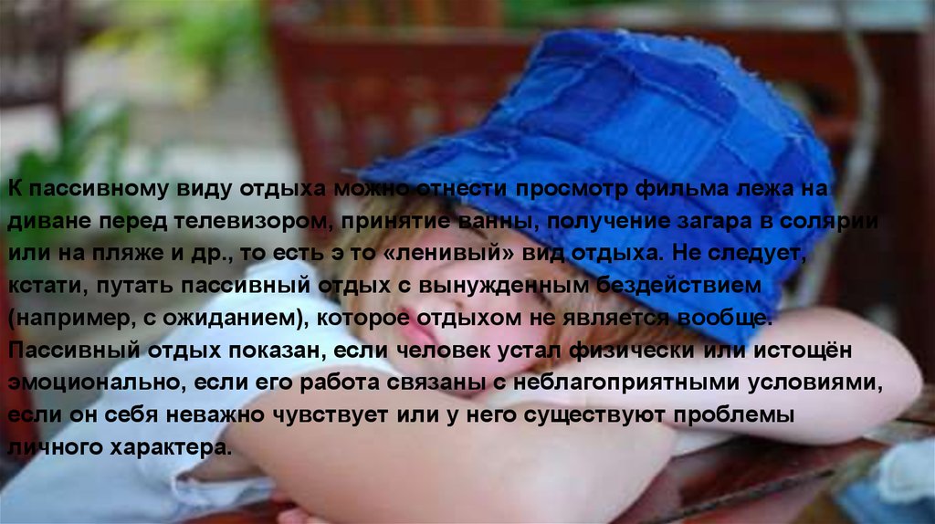 относительно не обремененное напряжением, потоком мыслей и какимито сложными задачами. Некоторые люди любят пассивный отдых