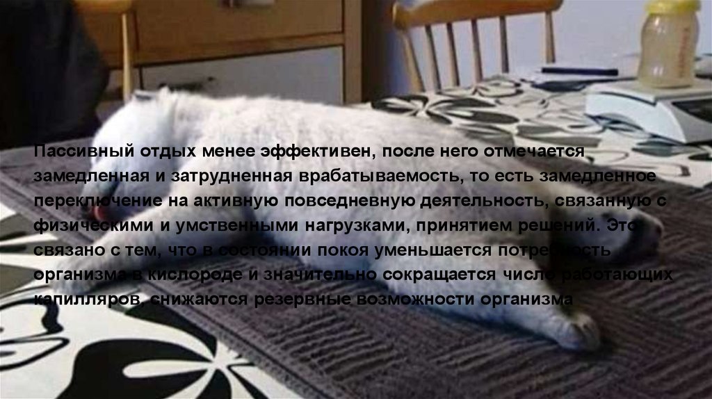 Пассивный отдых менее эффективен, после него отмечаетсязамедленная и затрудненная врабатываемость, то есть замедленное