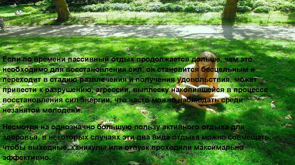 Если по времени пассивный отдых продолжается дольше, чем этонеобходимо для восстановления сил, он становится бесцельным и