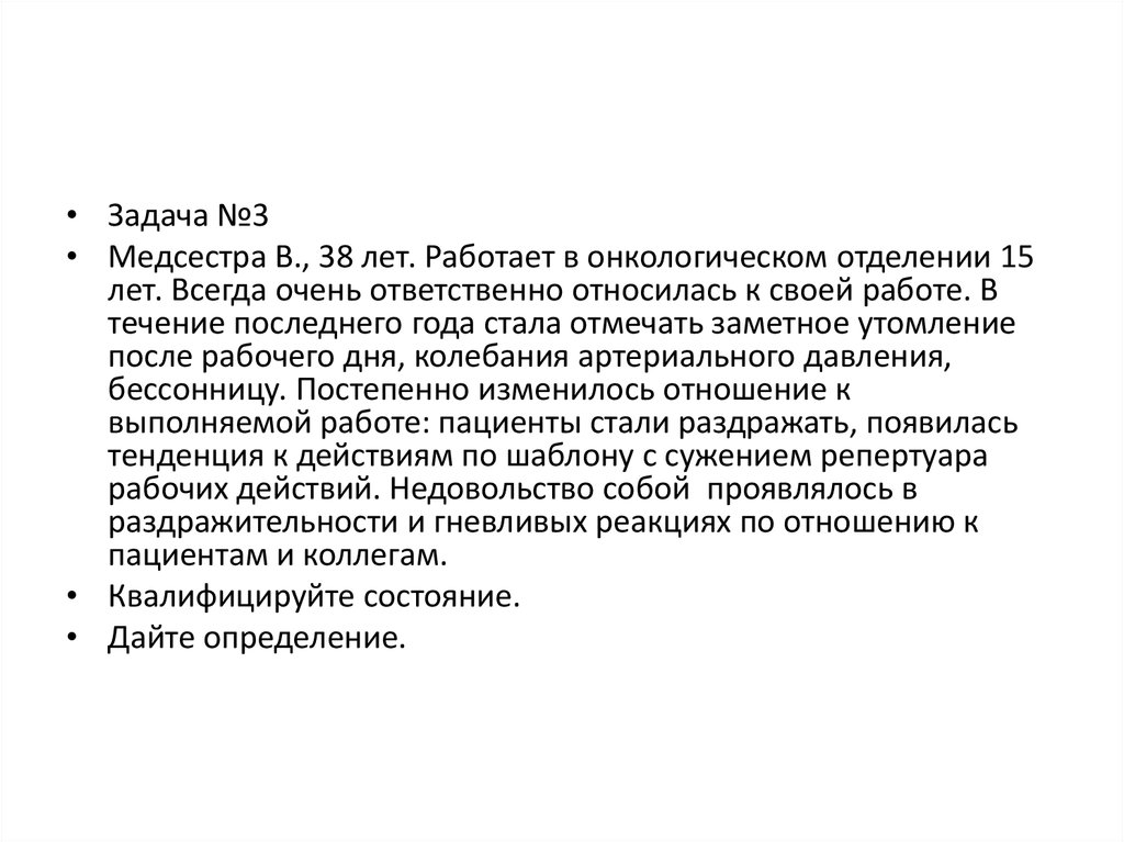• Задача №3• Медсестра В., 38 лет. Работает в онкологическом отделении 15