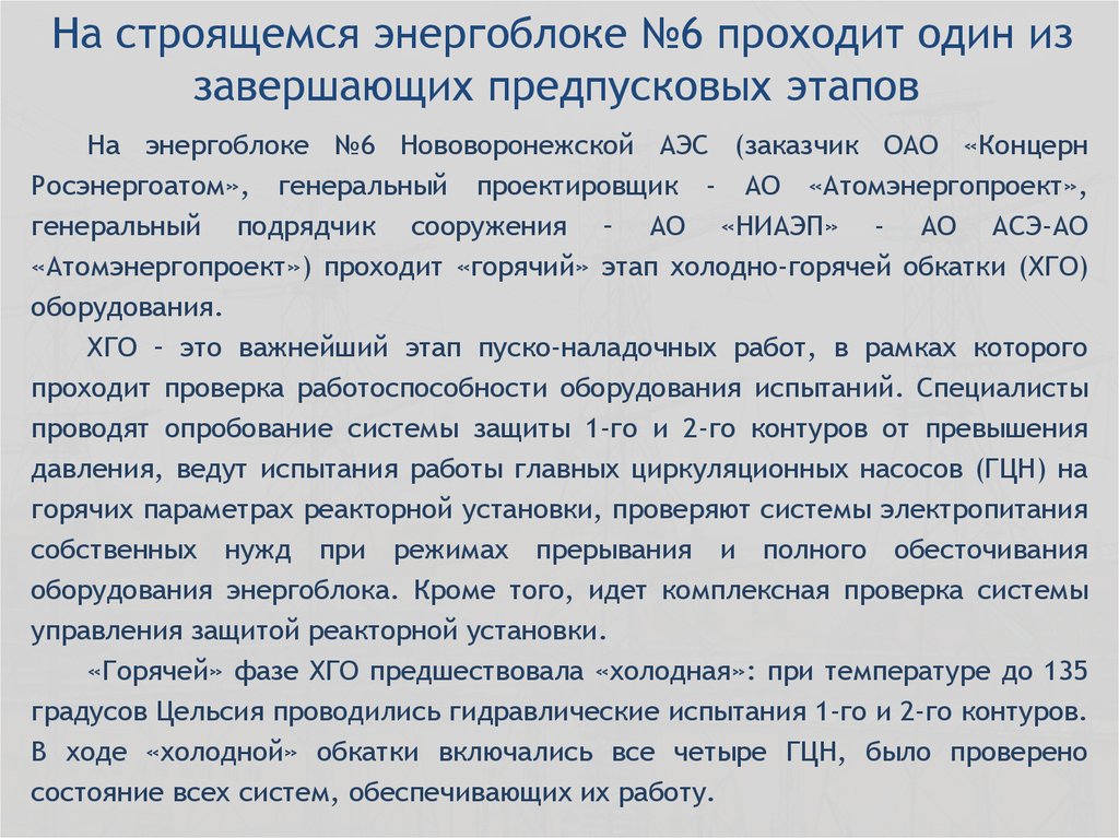 «Атомэнергопроект») проходит «горячий» этап холодно-горячей обкатки (ХГО)