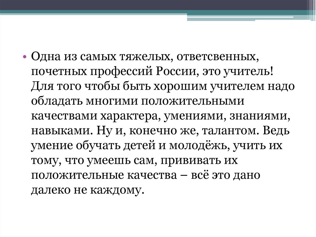 • Одна из самых тяжелых, ответсвенных,почетных профессий России, это учитель!