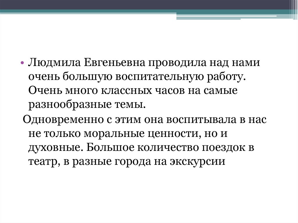 • Людмила Евгеньевна проводила над намиочень большую воспитательную работу.