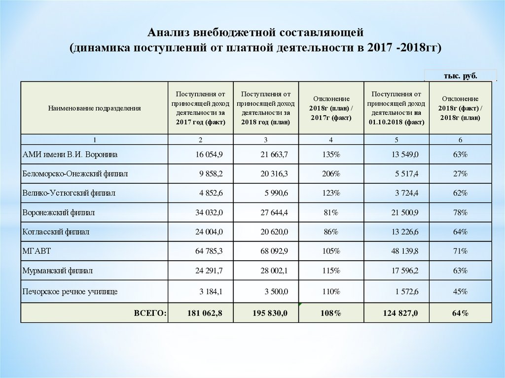 Анализ внебюджетной составляющей(динамика поступлений от платной деятельности в 2017 -2018гг)
