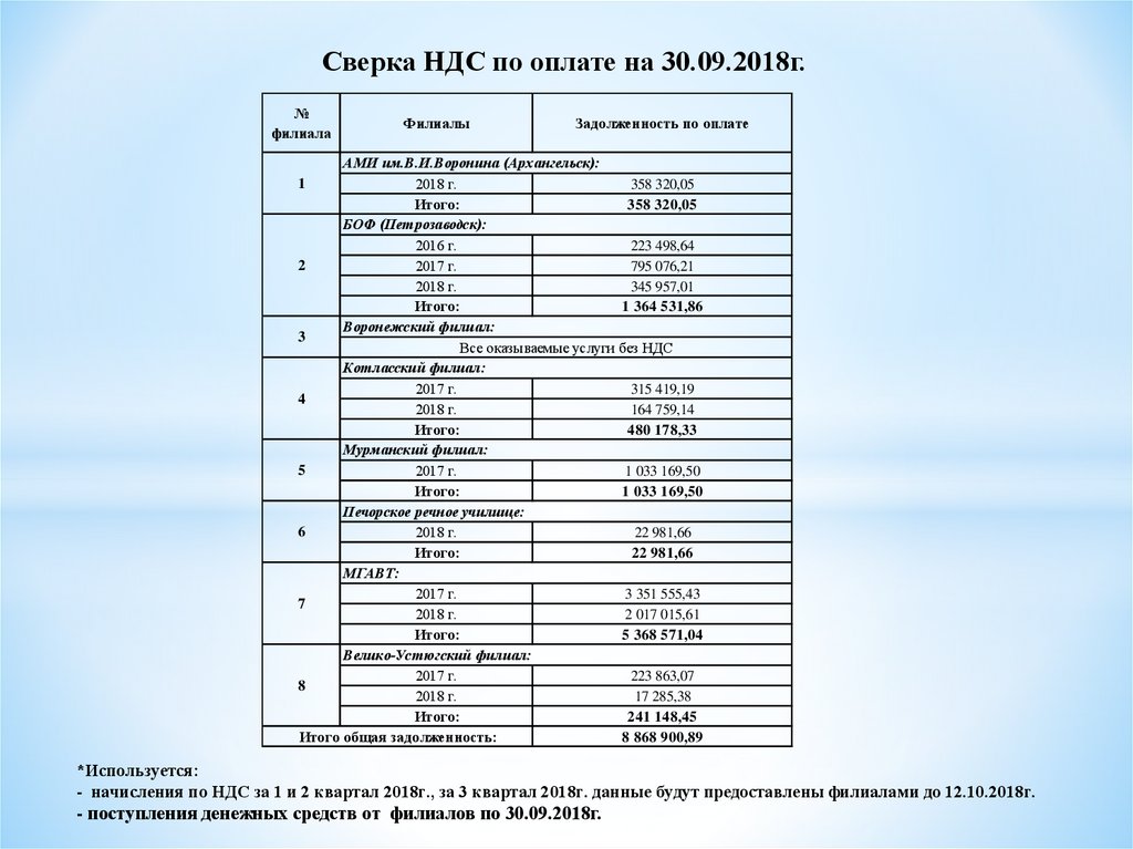 - начисления по НДС за 1 и 2 квартал 2018г., за 3 квартал 2018г. данные будут предоставлены филиалами до 12.10.2018г.